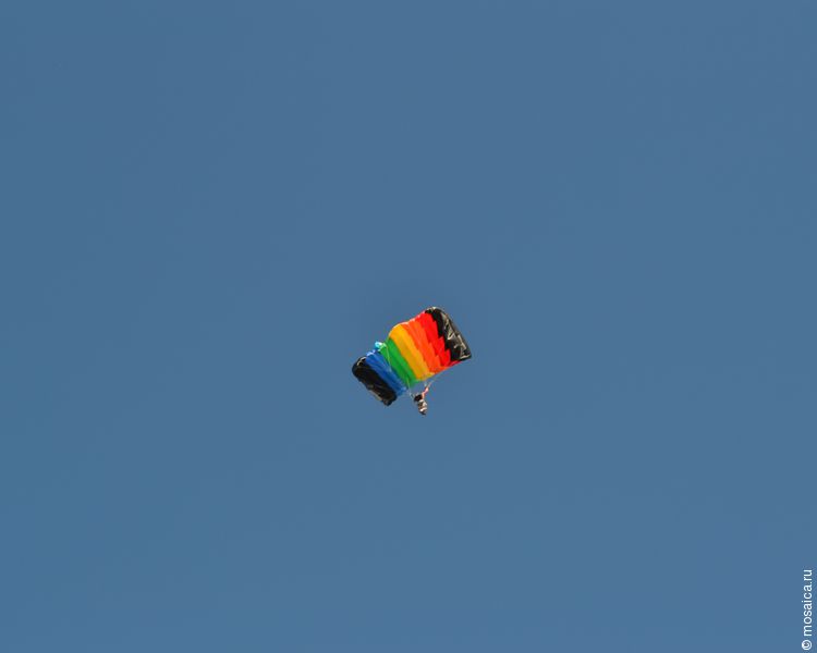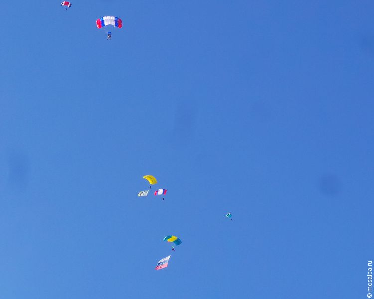 Заключительным аккордом праздника стало выступление пилотажных групп и прыжки парашютистов. Наверное, единственный минус авиашоу был в том, что самолёты часто летали против солнца, и приходилось очень сильно жмуриться.