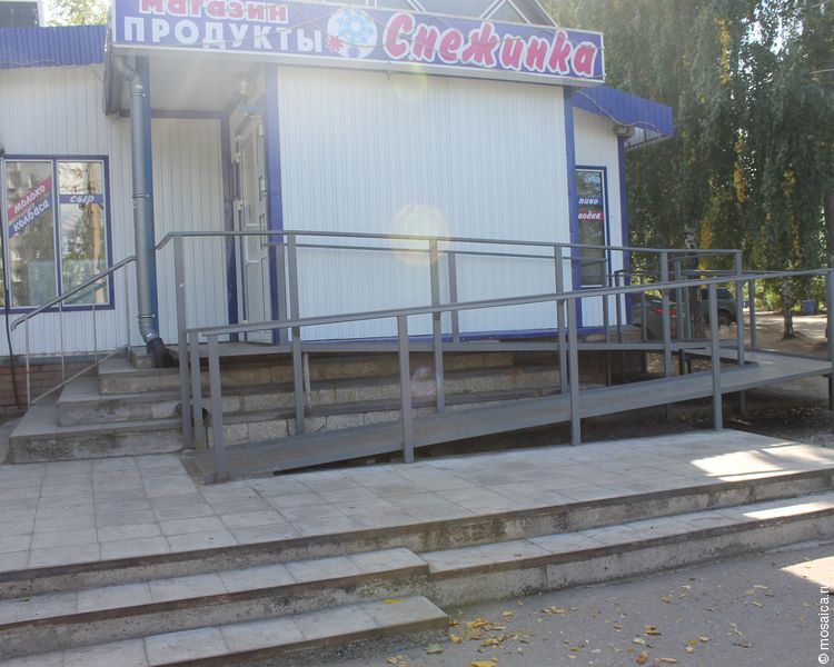 Несмотря на это до сих пор нет ограждения, бордюра со стороны дороги, пандус в магазине не подходит для колясочников. У другого магазина пандус от тротуара и вовсе отделяют несколько ступенек, по которым колясочникам явно не подняться.