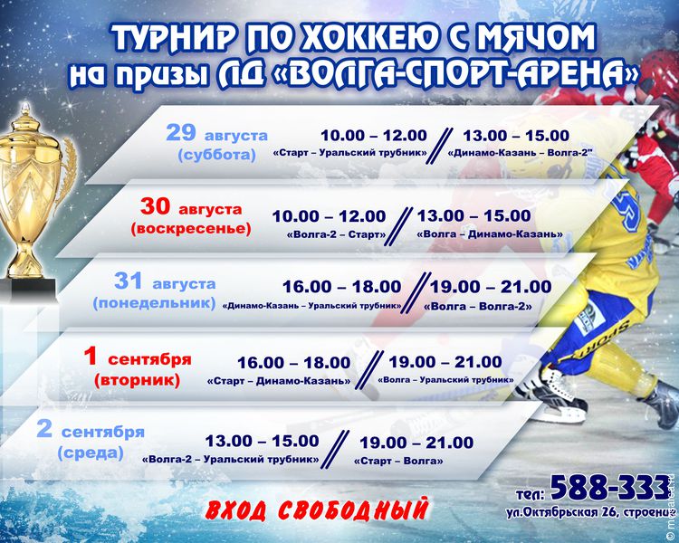 Таким образом, в этом предсезонном соревновании, которое состоится в ледовом дворце «Волга-Спорт-Арена», примут участие пять ледовых дружин: «Волга» (Ульяновск), «Старт» (Нижний Новгород), «Динамо-Казань» (Казань), «Уральский трубник» (Первоуральск) и «Волга-2» (Ульяновск). Приз турнира - Кубок ЛД «Волга-Спорт-Арена» - они разыграют по круговой системе.