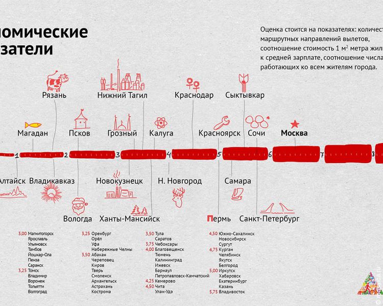 Например, чтобы оценить экономическую активность городов, агентство сравнивало их по числу маршрутных направлений вылетов, индексу стоимости жилья и соотношению числа работающих горожан к общему населению.