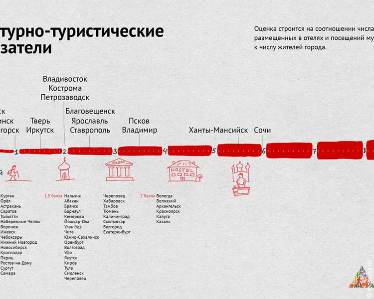 В культурно-туристическом блоке агентство «Городские проекты» оценивало отношение количества гостей города (правда, вычислить можно было только тех, что остановились в гостиницах) к числу жителей, а также учитывало приблизительное число людей, посещающих музеи, концертные залы, выставки.