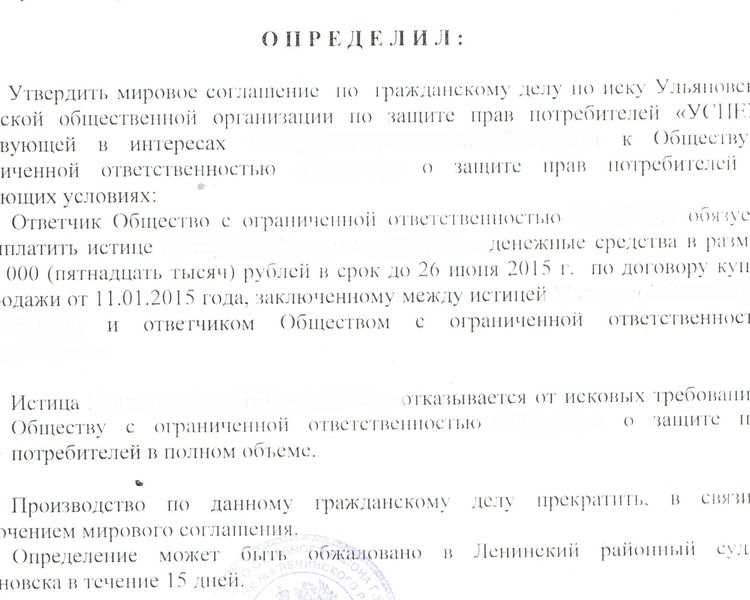 Дело дошло до суда, правда, только до мирового. Ответчик и истец решили все мирным путем: женщине перечислили деньги, и она отказалась от своих исковых требований.