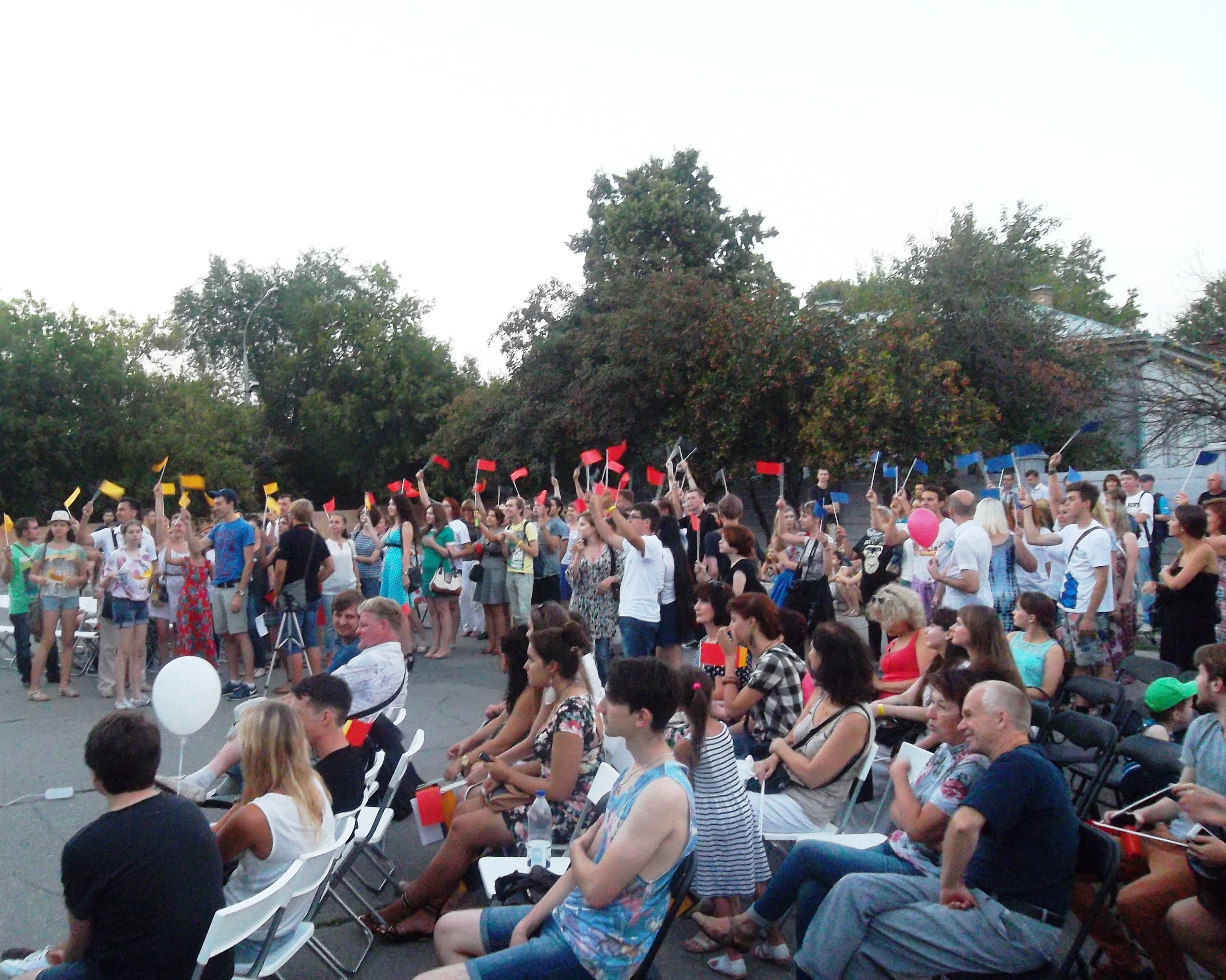 Каждому на входе давали флажки цветов российского и немецкого триколоров. Вскоре оказалось понятно для чего – с помощью волонтеров участники выстроились в две группы, образовав таким образом два флага стран.