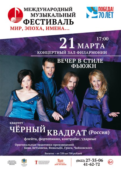 21 марта в 17.00 перед ульяновцами выступит фьюжн-вартет «Черный квадрат», который приедет к нам в город из Москвы. Исполнение у них будет не самое обычное — они смешают разные жанры, соединят джаз и рок-концерт. Участники квартета сыграют на флейте, фортепиано, контрабасе и ударных. Для гостей филармонии в этот вечер прозвучат произведения Вивальди, Чайковского, Грига, Бетховена и Баха.