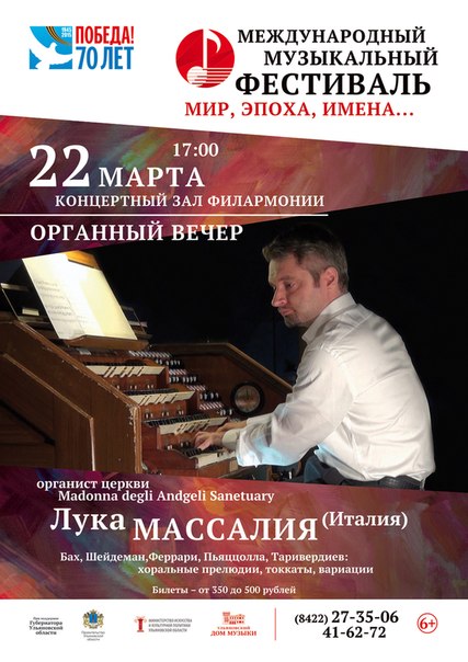 Вечер 22 марта обещает быть не менее интересным. На ульяновской сцене выступил главный органист церкви Madonna degli Andgeli Sanctuary в Турине Лука Массалия. Органист приедет к нам из Италии. Он исполнит произведения композиторов XVIII – XX веков.