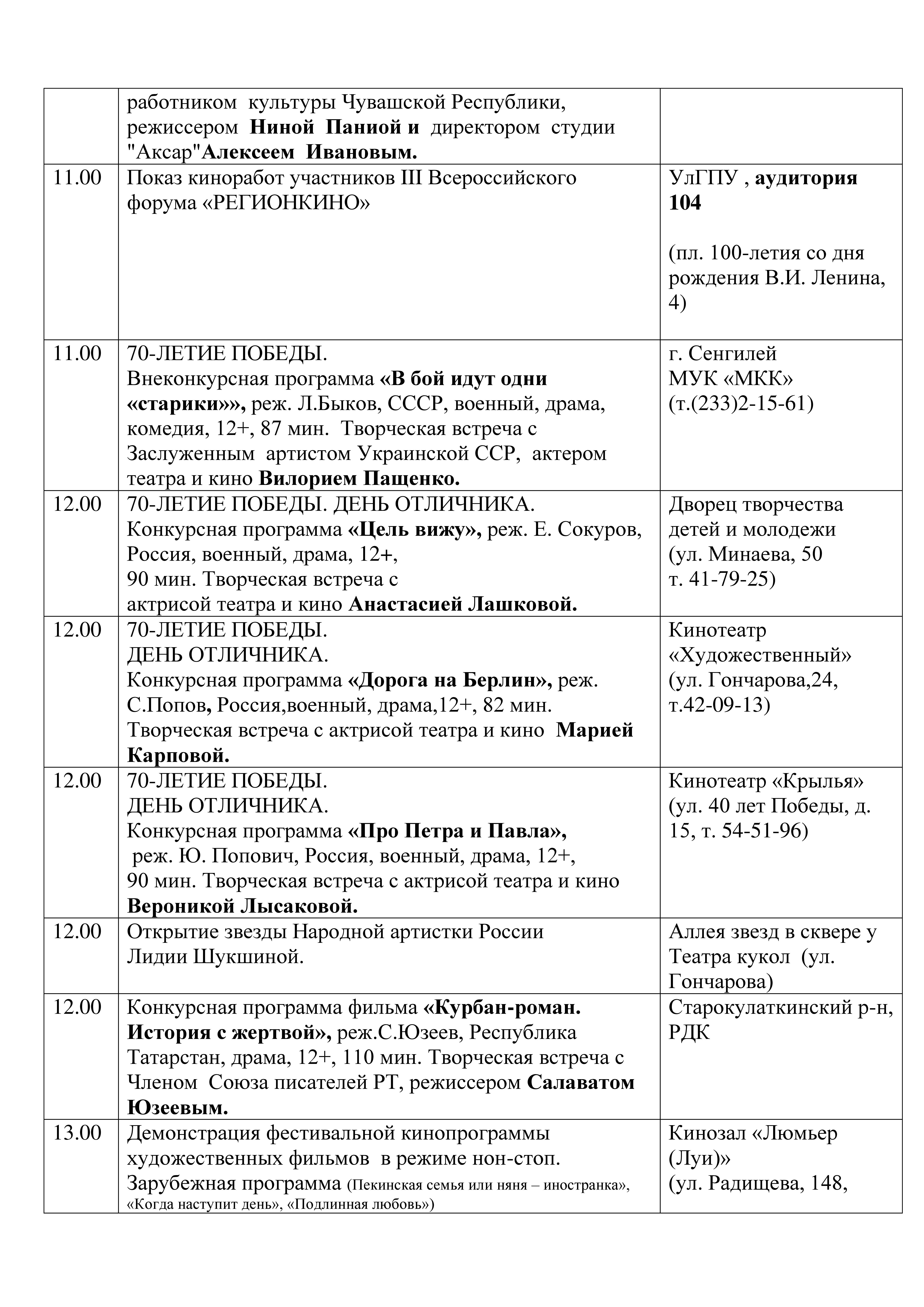 Конечно, не обойдется и без приезда известных актеров. Так, к нам в Ульяновскую область приедет народный артист России Владимир Хотиненко, Максим Дунаевский, Валерий Гаркалин, Ольга Прокофьева, Лидия Федосеева-Шукшина, Сергей Маховиков и супруги Александр и Екатерина Стриженовы.