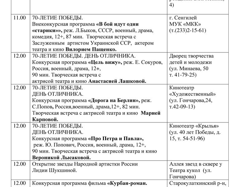 В этом году вся Россия отпраздновала 70-летие Победы в Великой Отечественной войне, так что кинофестиваль будет посвящен военной тематике. К примеру, горожанам покажут фильм «В бой идут одни старики», а желающие смогут посетить творческий вечер актера театра и кино Владимира Талашко и заслуженного артиста Украинской ССР Вилория Пащенко. Кроме этого, о войне расскажут фильм Андрея Прошкина «Переводчик» и фильм Евгения Сокурова «Цель вижу».