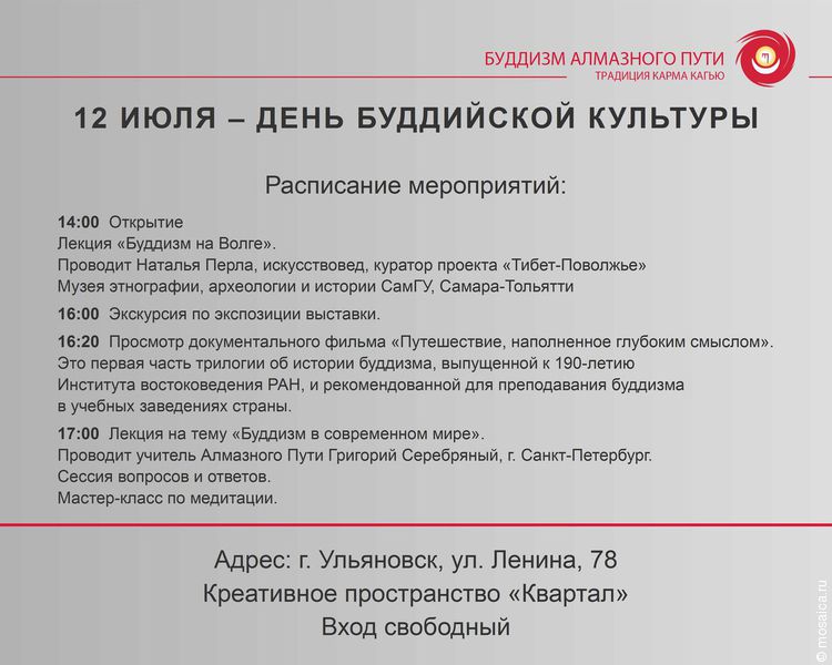 Напомним, что день, посвященный буддийской культуре, пройдет в «Квартале» 12 июля в 14.00. Вход свободный.