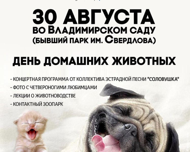 30 августа в 12.00 во Владимирском саду пройдет день домашних животных. Горожане смогут найти на выставке-ярмарке бездомных животных своего верного четвероногого друга и помочь приютам деньгами и кормом. Планируется, что своих питомцев покажет группа помощи животным «Кошкин дом».
