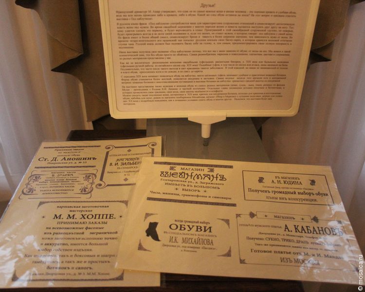 Есть на выставке и интересные обувные аксессуары конца XIX века: колодки для хранения и изготовления обуви, крючок для шнурования ботинок, набойки для сапог, рожок из магазина симбирянина Михайлова, каталог «Мюр и Мерилиз» с лучшими моделями, журнал для хозяек с подробным описанием, как в домашних условиях сшить обувь. Следует обратить внимание и на интересные рекламные и информационные плакаты того времени, посвящённые обуви.