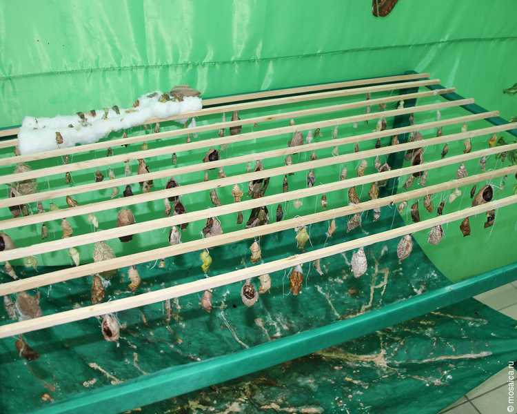 В комнате поддерживается специальная температура, благодаря которой бабочки чувствуют себя как дома. Более того – здесь они и «рождаются» из куколок, которые висят здесь же.