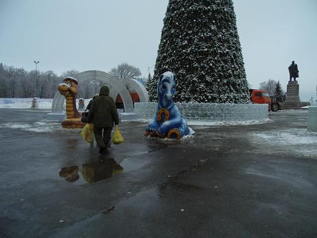 На сцене, установленной посреди площади Ленина, мы заметили оживление. Опоздали и конкурс уже завершен? … Вместе с участниками конкурса на сцене стояла парочка снеговиков – неужели участники свои творения на сцену выносят? Нет, показалось. Снеговики не настоящие.
