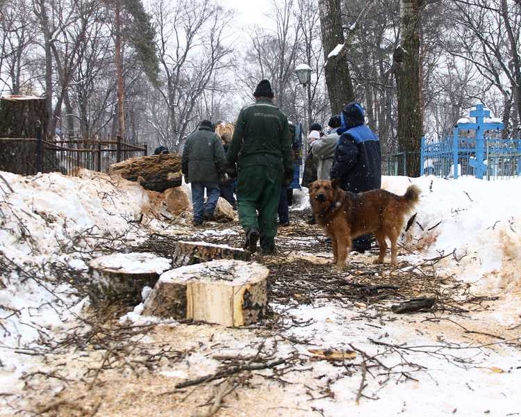 Первое, что мы услышали, зайдя на территорию кладбища, - звук бензопилы. Пройдя чуть дальше вглубь, увидели спецмашину и рабочих, которые, несмотря на снегопад, спиливали огромные деревья.