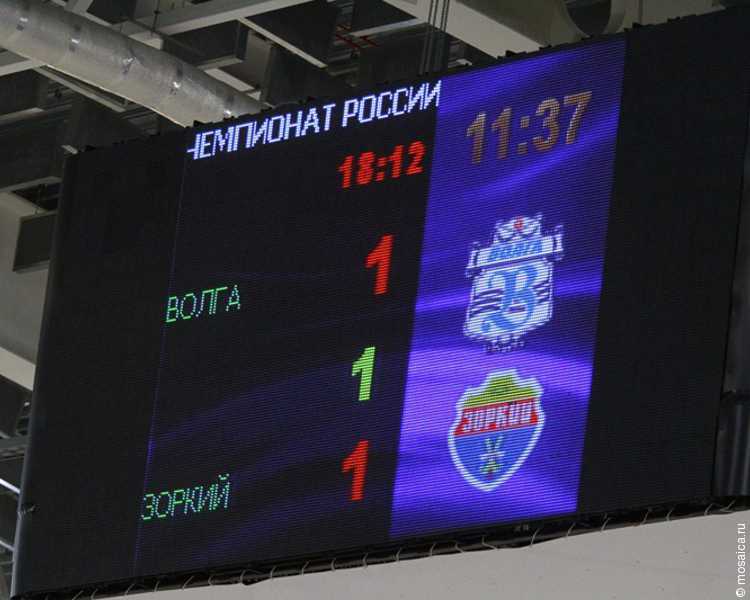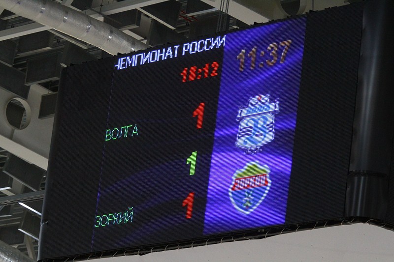 В игре с «Зорким», по сравнению с предыдущим матчем против нижегородского «Старта», главный тренер «Волги» Дмитрий Маланин сделал лишь одну перестановку в стартовом составе. Вместо Сергея Шебонкина в центре полузащиты вышел Денис Корев. И, по крайней мере, до перерыва он был одним из самых активных на льду ульяновского ЛД «Волга-Спорт-Арена». Впрочем, в первом тайме вся «Волга» смотрелась предпочтительнее, чем в дебютной игре сезона. Ульяновцы отвечали ударом на удар. Стоило гостям на 8-й минуте открыть счет, как вскоре волжанин Садовский его сравнял. Затем красногорцы вновь повели в счете, благодаря реализованному 12-метровому штрафному удару. Однако, не прошло и минуты, как пенальти забил уже хоккеист нашей команды Пашкин. В третий раз сделать счет равным в этом поединке волжанам удалось на 37-й минуте, когда все тот же Пашкин оформил дубль еще одним ударом с «точки». А на последних секундах первого тайма свой второй мяч в игре забил другой волжанин - Садовский, мастерски реализовавший розыгрыш углового. Таким образом, на перерыв волжане отправились, лидируя в счете – 4:3. При этом, стоит отметить, что по количеству ударов по воротам «Зоркий» в первом тайме превзошел «Волгу» почти в три раза!