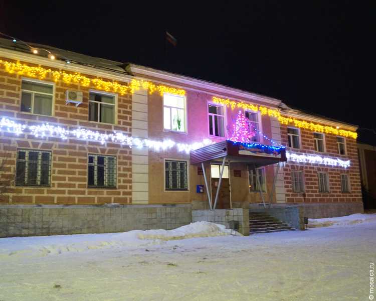 Здание администрации украшает море разноцветных лампочек, а на его крыше установлена елка.