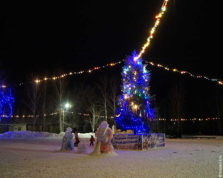 Также на площади установлена деревянная избушка и горка для детей. Когда-то горок было две – одна для малышей, а другая для более взрослых детей. Со временем маленькая горка пропала, а вместо нее на площади стал появляться деревянный домик. Если говорить в общем, то площадь действительно хорошо украшена – везде светло, стоят елочки, развешаны разноцветные гирлянды.
