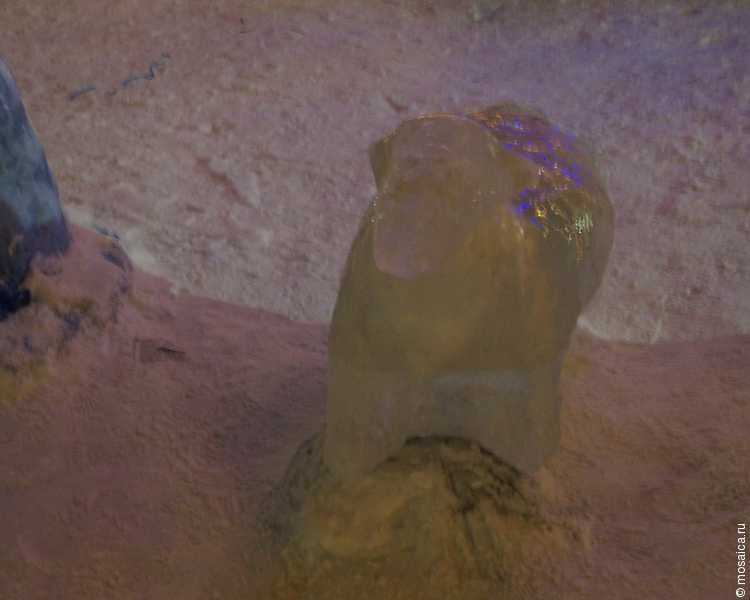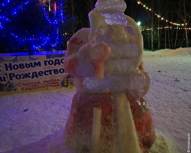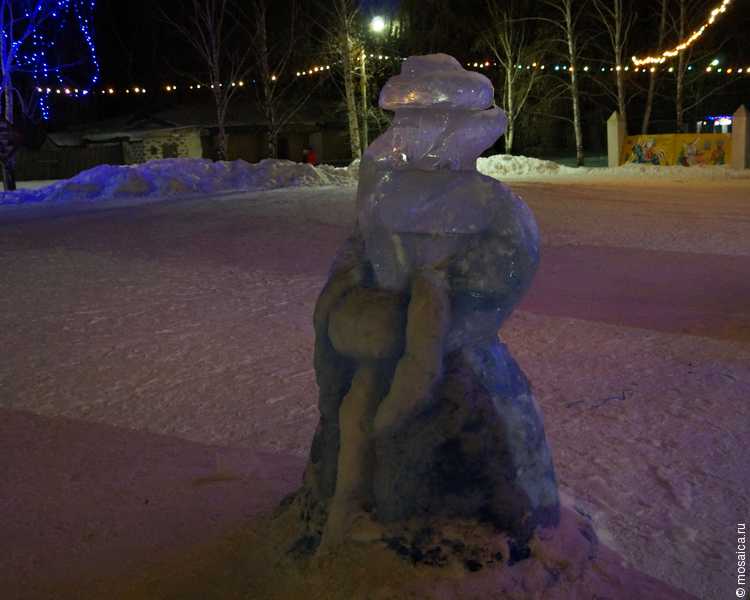 Главная площадь рабочего поселка оказалась украшена, как и всегда – в центре установлена большая елка, рядом с которой красуются фигуры изо льда. Если Деда Мороза и Снегурочку еще как-то можно узнать, то с символом следующего года оказалось все намного сложнее – наверное, это все-таки овечка.