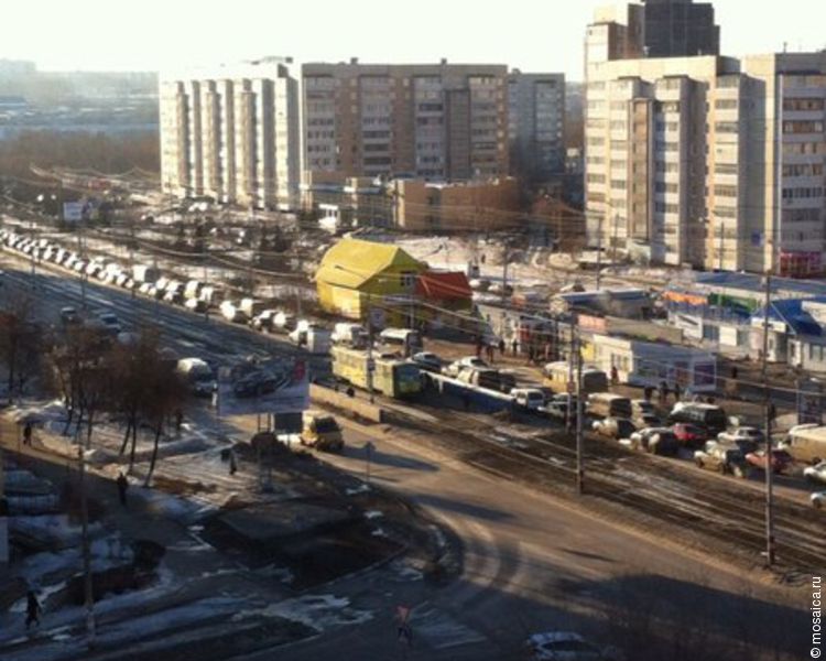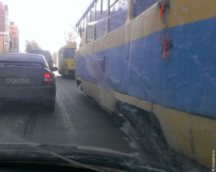 - У школы №4 на улице Радищева огромная пробка. Стоят даже трамваи.