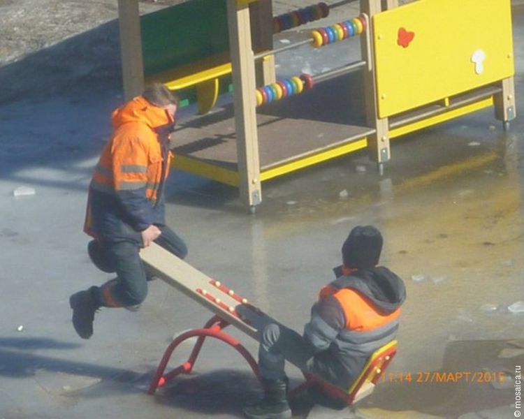 - Происходит сие веселое действо на Невского, 2б, корпус 4. Сначала один другого на качельке катал, потом мужчины на другую качель пересели. А в конце еще на льду кружились! Они классные! - пишут очевидцы.