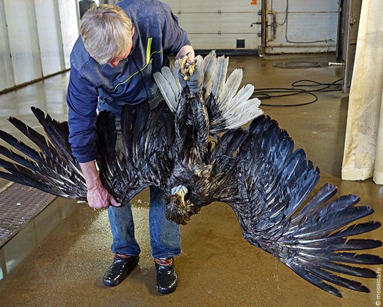 Как удалось узнать, замерзающую птицу в полынье нашел местный житель Елабуги. Он взял себе орлана, оказал первичную помощь, смыл с него мазут на автомойке, днем и ночью топил печь, чтобы поддерживать нужную температуру в помещении - пропитанное мазутом оперение потеряло свою защитную функцию. А потом спаситель вез птицу 200 км до камской переправы, закутанную в ватное одеяло, как маленького ребенка. Хотя на деле это 7-летний самец с размахом крыльев шире двух метров. Только после трагедии он стал беспомощен, как дитя.