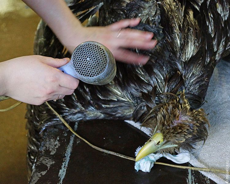 - Сегодня мы извели 5 кг порошка, литр моющего средства, меняли черную от мазута воду в ванной 5 раз, обтирали мазут, полоскали каждое перышко. Мыли, мыли, мыли... Потом сушили профессиональным феном три часа. Поставили катетер, даем лекарства, завернули в теплые тряпки, чтобы не мерз постоянно, дуем горячим воздухом из фена и, несмотря на все это - он спит, - рассказала ветврач Ольга Данилова.