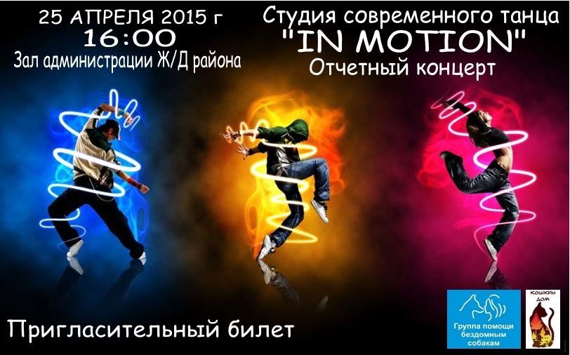 25 апреля в Ульяновске пройдет концерт студии современного танца «In motion», на котором презентуют группу помощи бездомным собакам и объединение «Кошкин дом». Один представитель от обеих групп расскажет, чем занимаются волонтеры и чем им можно помочь, покажет видеопрезентацию о проделанной работе.