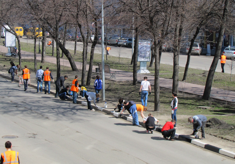 В этом году почётное право покрасить бордюры досталось дорожному комитету. Офисные сотрудники, одетые явно не по форме под «кислотными» жилетами, отмывают бордюры от грязи и покрывают краской. Делают они это с видимым удовольствием: после затяжных метелей и дождей первые по-летнему солнечные и тёплые дни просто шепчут о прогулках на свежем воздухе.