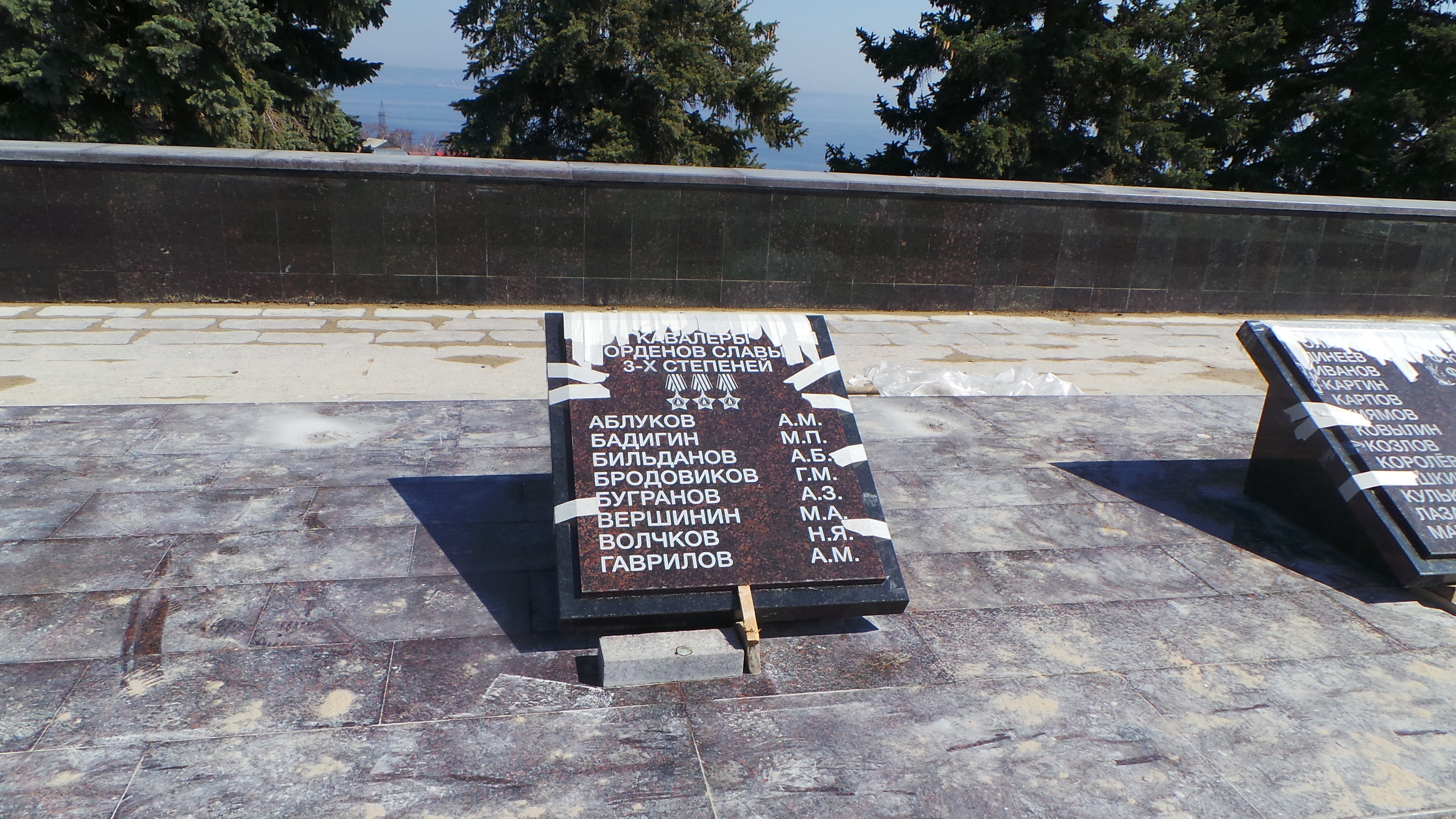 А вчера рядом с обелиском появились и мемориальные плиты. Они уже окончательно установлены и проклеены, но пока на них поддерживающие конструкции, чтобы детали лучше скрепились, да и чтобы горожане пока не трогали.