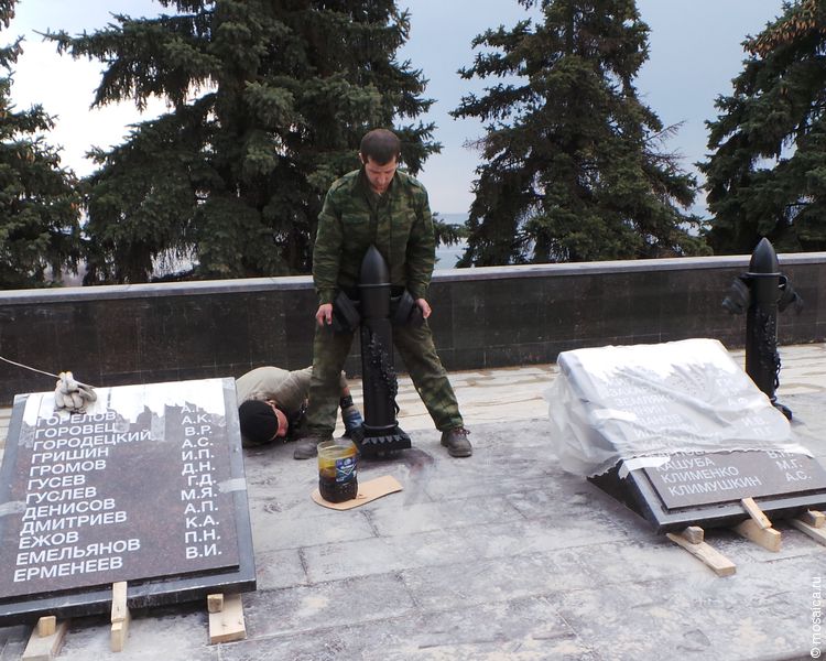 Затем возле плит устанавливали столбы, приклеивали их с помощью эпоксидной смолы. Каждый столб весит 33 кг. Сегодня между ними должны появиться цепи, а на плитах - ордена и медали.