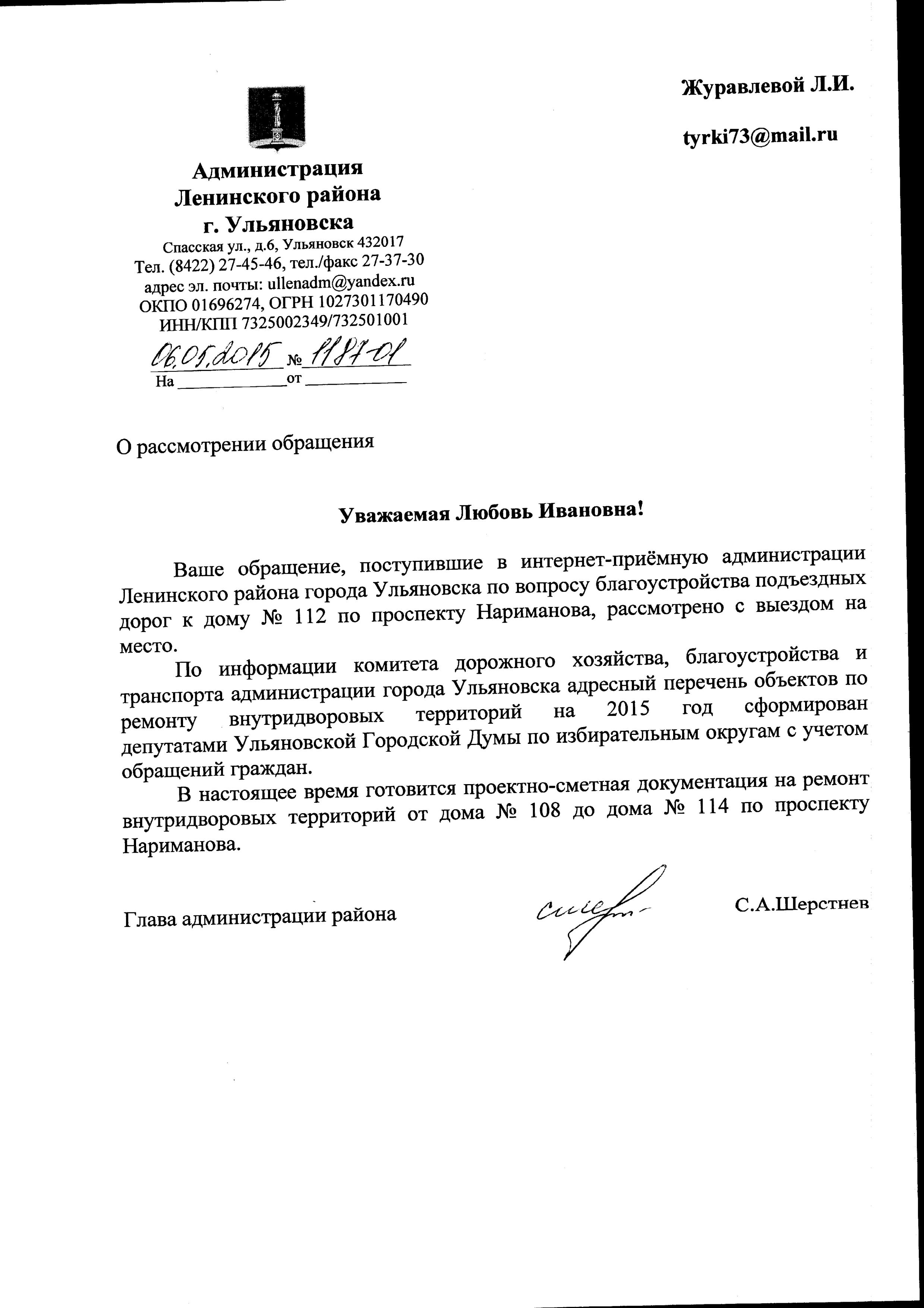 Да-да, с 15 апреля ничего не изменилось. Зато из администрации Ульяновска и администрации Ленинского района пришли абсолютно одинаковые письма, в которых говорится, что внутриквартальную дорогу отремонтируют... где-то в 2015 году.