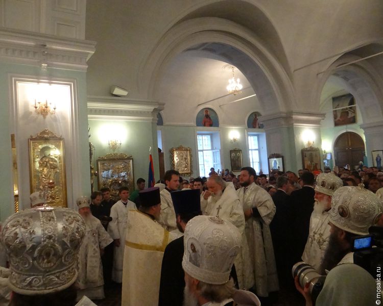 Служба началась в 16.00, а в 17.00 прибыл Патриарх Кирилл.Его Святейшеству сослужили: митрополит Санкт-Петербургский и Ладожский Варсонофий, управляющий делами Московской Патриархии; митрополит Оренбургский и Саракташский Валентин; митрополит Чебоксарский и Чувашский Варнава; митрополит Уфимский и Стерлитамакский Никон; митрополит Симбирский и Новоспасский Феофан; митрополит Нижегородский и Арзамасский Георгий; митрополит Саратовский и Вольский Лонгин; митрополит Саранский и Мордовский Зиновий; архиепископ Йошкар-Олинский и Марийский Иоанн; епископ Солнечногорский Сергий, руководитель Административного секретариата Московской Патриархии; епископ Барышский и Инзенский Филарет; епископ Смоленский и Рославльский Исидор; епископ Мелекесский и Чердаклинский Диодор; архимандрит Сергий (Зятьков), избранный и нареченный во епископа Вяземского и Гагаринского; протоиерей Владимир Самойленко, секретарь епархиального управления Симбирской епархии; духовенство Симбирской митрополии.