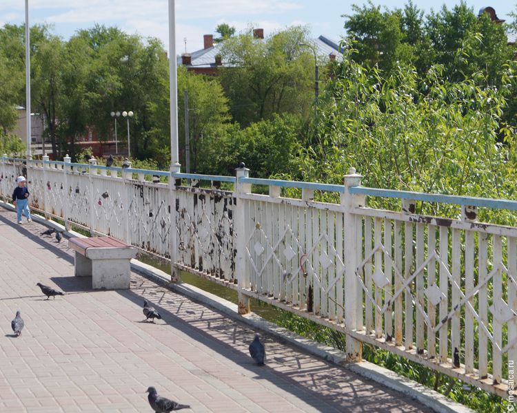 Как оказалось, местные жители были правы: хоть на мосту и положили плитку, и выглядит она довольно прилично, перила у моста смотрятся куда хуже — краска облезла, перила покрыты ржавчиной, местами перила изрисованы и на ограждении красуются следы пребывания горожан — бутылки из-под пенного. Какая-то недоделанность, половинчатость получается. Как будто начали порядок наводить, а потом надоело - и бросили на полпути.