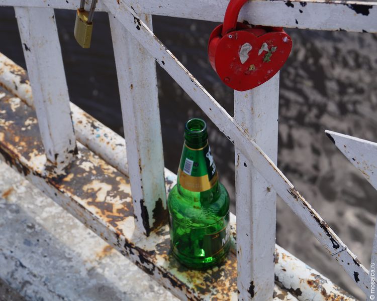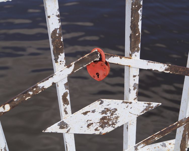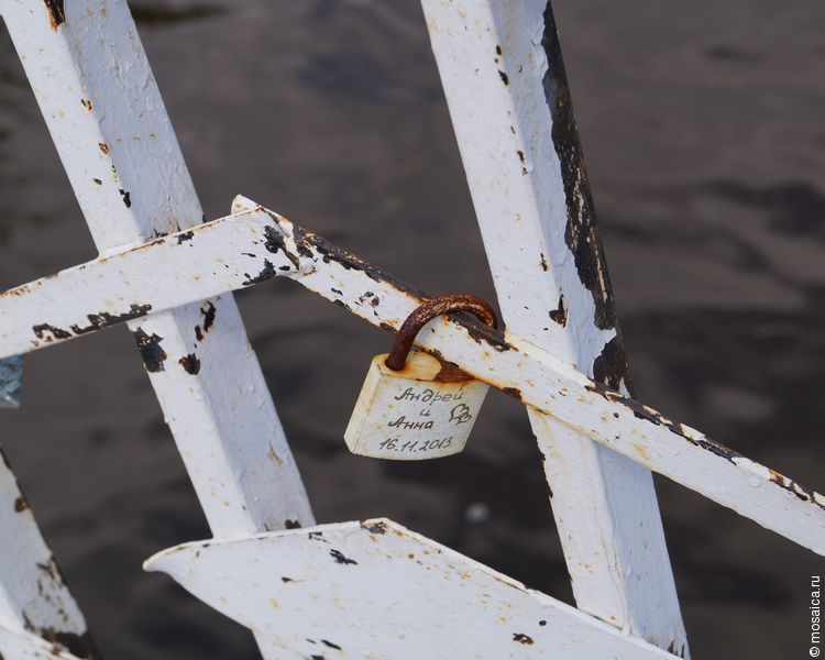 Сами же ограждения, несмотря на изношенность, облеплены замками — здесь часто гуляют молодожены, которые и крепят эти замочки на счастье.