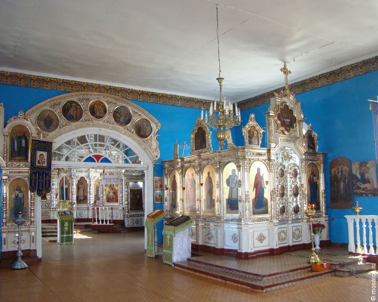 Главный алтарь освящен в честь Казанской Божьей Матери, в правой части притвора, где располагается престол, второй алтарь освящен в честь Святых Первоверхних Апостолов Петра и Павла.