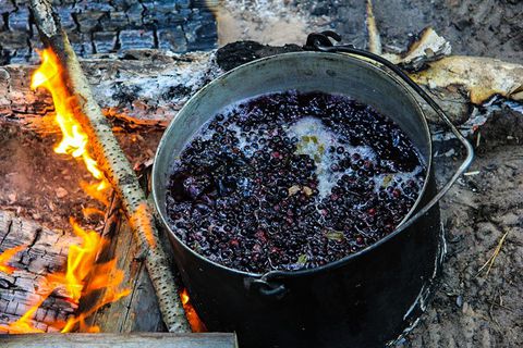 Рецепт компота очень прост: 2 стакана черники, 4 ложки сахара, 4 литра воды. Доводим до кипения и минут на 5 ставим рядом с костром, чтобы потомилось. Всё. Можно пить. Но лучше – когда остынет.