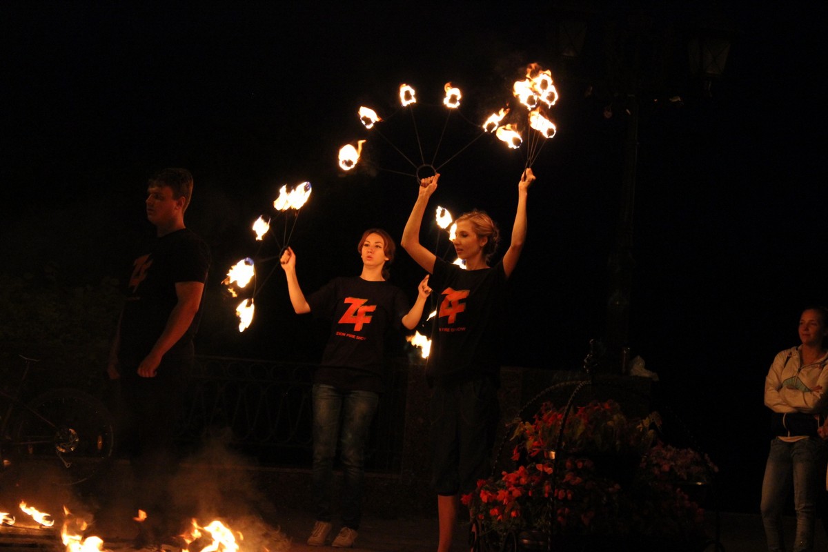 Прогуливавшиеся вечером горожане стали свидетелями потрясающего по красоте действа – огненного шоу в исполнении команд «ОГОНЬ и Я», ZION и Brainshtorm. На площадке у фонтана собралась почти сотня зрителей.