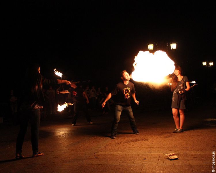 Юноши и девушки приводили публику в восторг яркими - во всех смыслах - номерами. А в знак благодарности зрители постепенно пополняли взносами сумку, специально поставленную в начале программы. К финалу программы самые смелые зрители получили возможность поменятьcя ролями и самим стать участниками огненного представления. С чем они прекрасно справились.