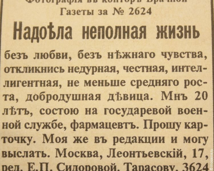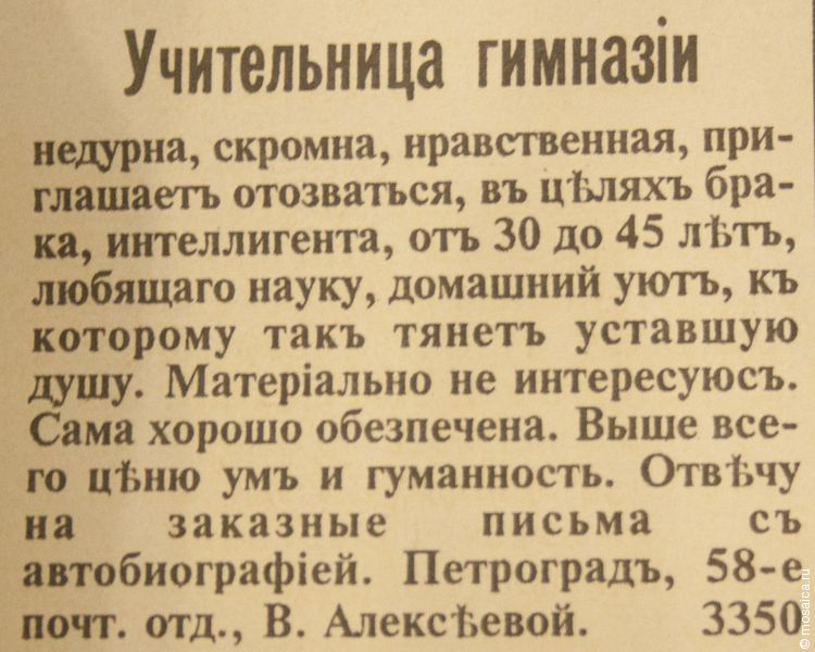 А вот, например, характерное объявление того времени, в котором не глядя выдают замуж бедную родственницу.