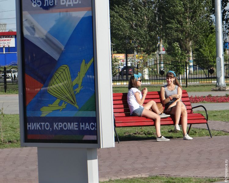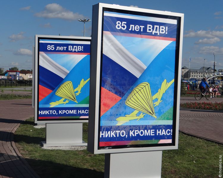 Сам парк, за которым присматривают десантники, получился очень красивым. Видно, что за клумбами ухаживают, мусора нигде нет, растут цветы, установлены лавочки и стоят щиты с портретами выдающихся военнослужащих.