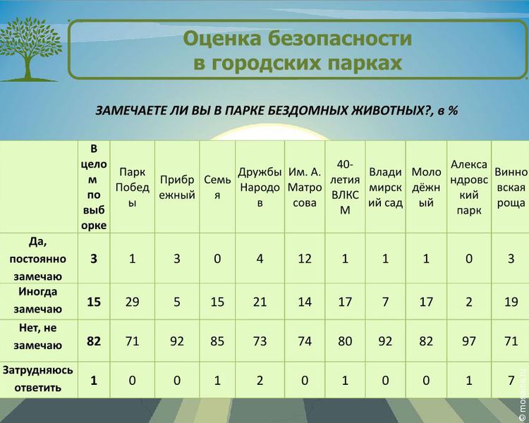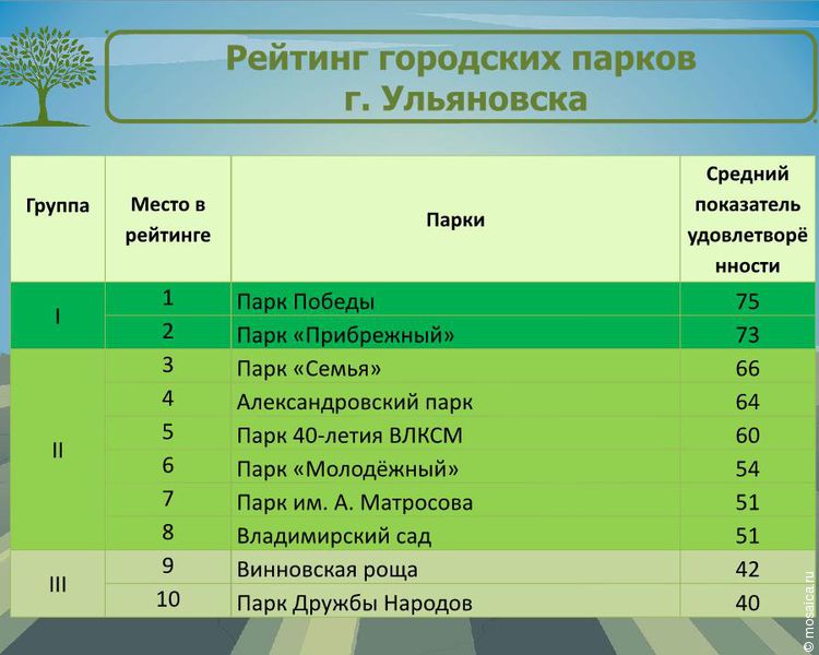 Оказалось, что родители с детьми предпочитают посещать парк «Молодежный», Винновскую рощу, парк «Прибрежный», Александровский парк и парк Победы. Молодежи больше нравятся парк Дружбы народов и Владимирский сад. Ульяновцы в возрасте любят неспешно прогуливаться по парку «Семья» и имени Матросова.
