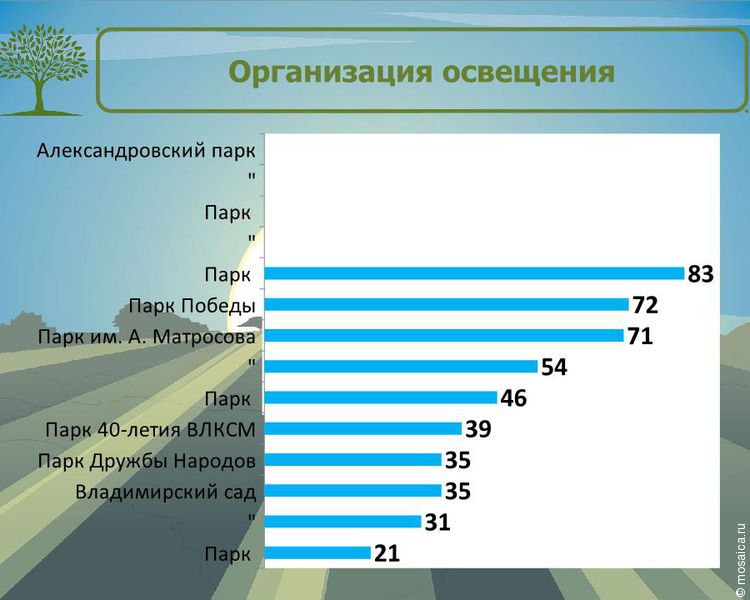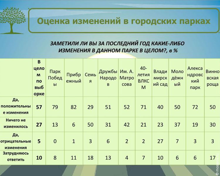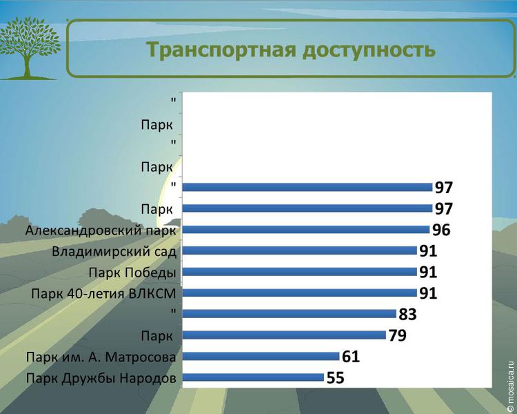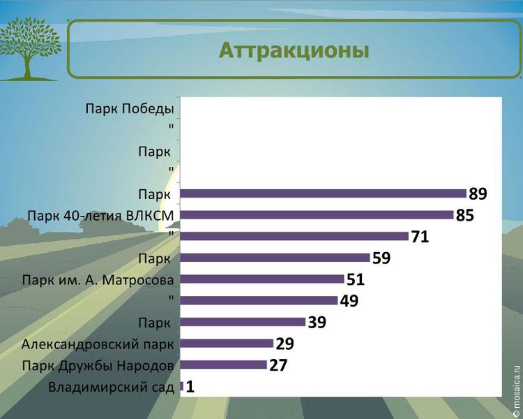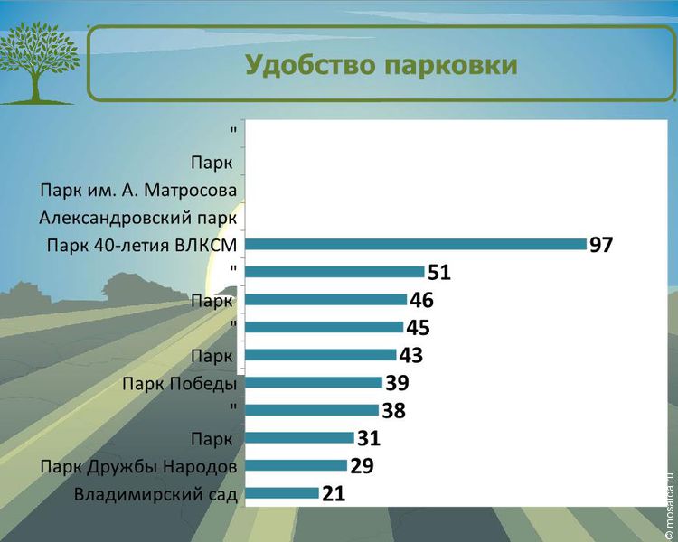 В самом рейтинге представлены следующие парки: парк Победы, парк «Прибрежный», парк «Семья», парк Дружбы народов, парк имени Матросова, парк 40-летия ВЛКСМ, Владимирский сад, парк «Молодежный», Александровский парк и парк «Винновская роща». Их оценивали сразу по нескольким критериям.