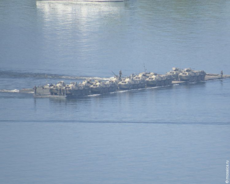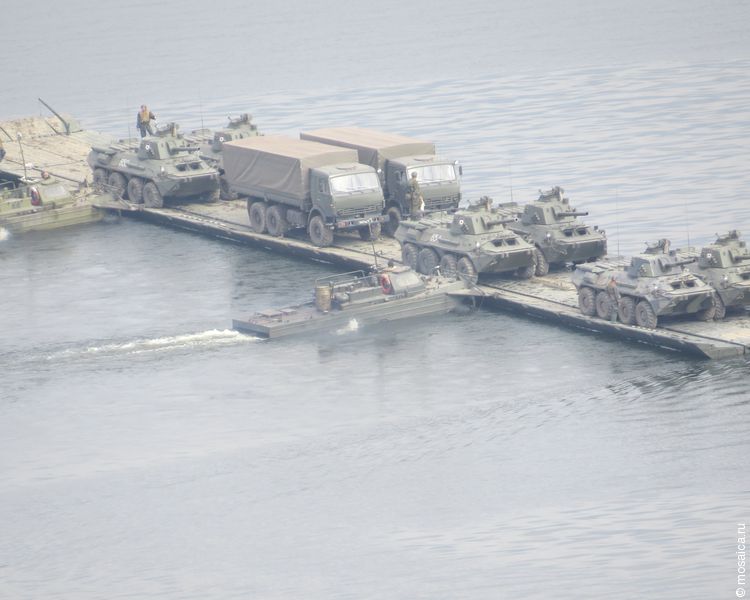 Главной задачей, стоявшей сегодня перед военнослужащими, было развертывание складской инфраструктуры по обоим берегам Волги, погрузка и перевозка техники и материальных средств речными паромами из барж-площадок и четырьмя 170-тонными паромами из комплекта понтонно-мостового парка. Собственно, самих паромов издалека видно не было, поэтому создавалось впечатление, что танковая колонна движется прямо по воде.