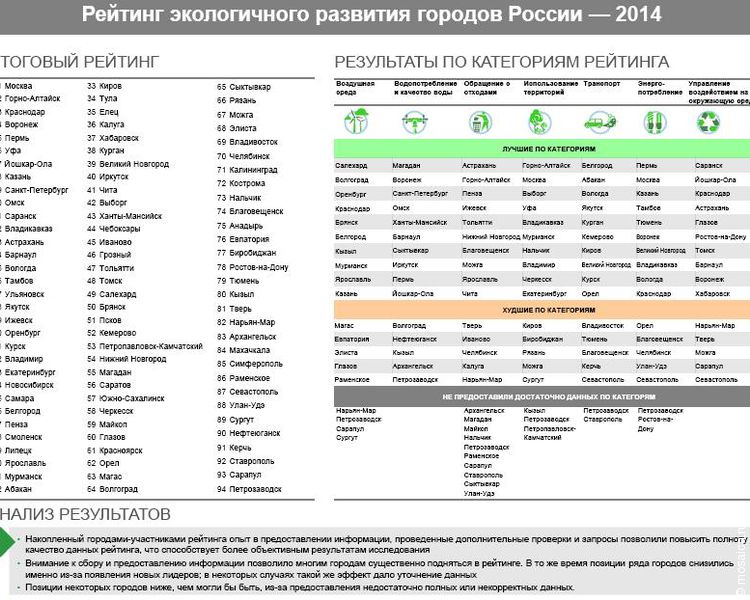 В 2014 году в лидеры экологического рейтинга попали Москва, Горно-Алтайск, Краснодар, Воронеж, Пермь, Уфа, Йошкар-Ола, Казань, Санкт-Петербург и Омск.