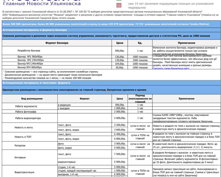 Сведения о размере и других условиях оплаты площади на выборах депутатов Ульяновской Городской Думы пятого созыва 13 сентября 2015 года