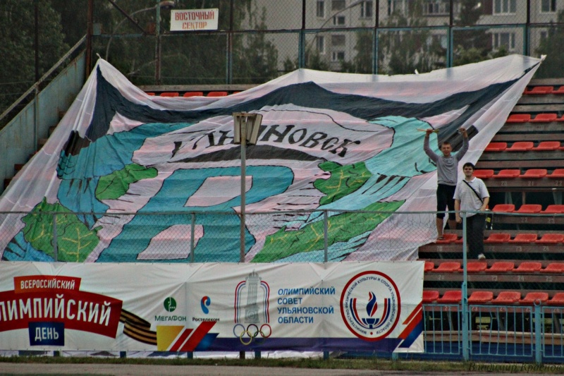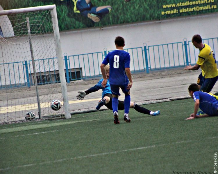 Поединок на заволжском стадионе «Старт» начался с атак димитровградских футболистов. В результате уже на 9-й минуте гости открыли счет – отличился Марс Сахабутдинов. Пропустив гол, ульяновцы попытались «отплатить той же монетой», но отыграться волжанам удалось лишь по истечении получаса игры. Точным ударом в составе волжан отметился Дмитрий Краснов. Но равенство в счете продержалось недолго – всего пять минут. Нападающий «Димитровграда» Леонид Романченко вернул своей команде лидерство, а за несколько секунд до перерыва упрочил преимущество гостей – 1:3.