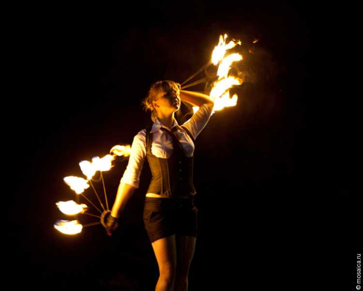 А уже в девять вечера, когда чуть стемнело, начались выступления фаерщиков. Каждый участник подготовил свой выход, отличавшийся направлением, исполнением и оригинальностью. Были здесь и сцены любви, и черепашка-ниндзя, и грациозные танцовщицы.
