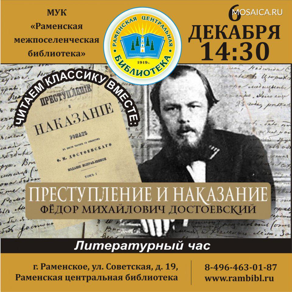 Жителей и гостей Раменского городского округа приглашают посетить местную библиотеку. В пятницу, 6 декабря, там пройдет литературный час, который было решено посвятить творчеству Федора Достоевского.