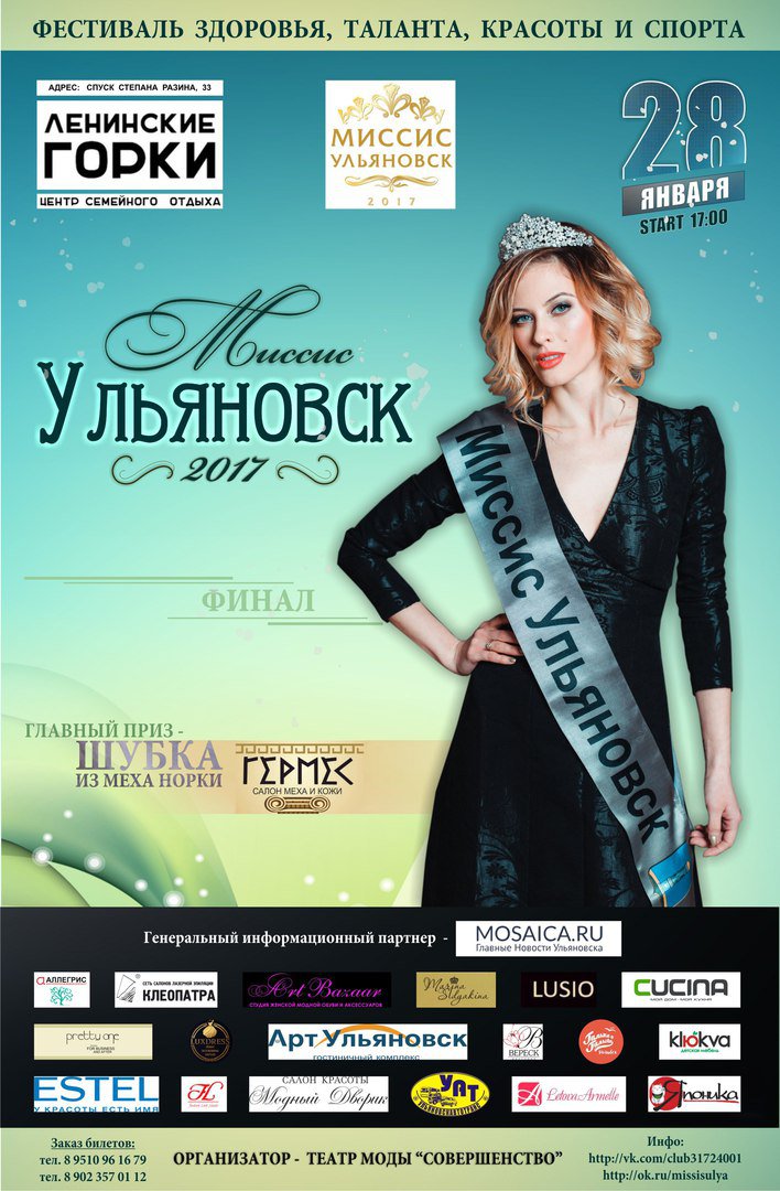 28 января в «Ленинских горках» выберут «Миссис Ульяновск – 2017». Всего за титул поборются 16 красавиц. В финале участницы должны будут покорить жюри своей красотой, талантом, интеллектом. Главный приз – шубка из меха норки.