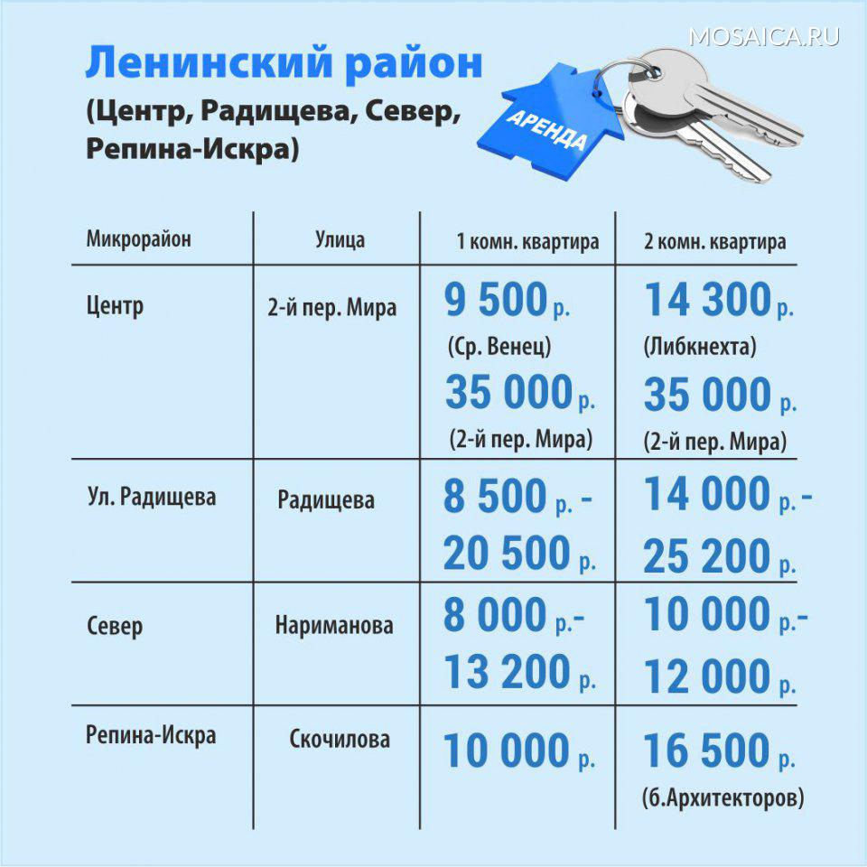 Мы изучили предложения по аренде жилой недвижимости в Ульяновске по открытым источникам и составили для вас таблицу цен на аренду "однушек" и "двушек" по районам и кварталам. Именно такие квартиры наиболее востребованы у ульяновцев снимающих жилье.