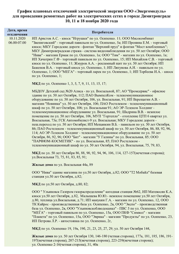 Как пояснили в пресс-службе администрации Димитровграда, ООО «Энергомодуль» предупреждает о плановых отключениях электрической энергии для проведения ремонтных работ на электрических сетях. Работы будут проводиться 10, 11 и 18 ноября.
